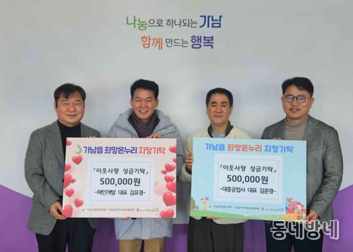 동네방네 김형규 기자 | 여주시 가남읍 행정복지센터는 지난 9일, 해인개발과 대흥공업사에서 관내 어려운 이웃을 위한 성금 각 50만 원을 기탁하고, ‘가남읍 희망온누리’ 정기기부에 신규 참여했다고 밝혔다.