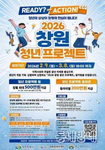 동네방네 김형규 기자 | 창원특례시는 지역 청년들이 사회 의제를 직접 발굴하고 해결하는 과정을 지원하기 위한 창원청년비전센터 ‘2026년 창원 청년 프로젝트’ 참가 팀을 2월 9일부터 3월 8일까지 모집한다고 밝혔다.