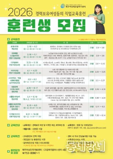 동네방네 김형규 기자 | 제주특별자치도가 경력 보유 여성과 재직 여성의 재취업을 돕기 위해 올해 여성새로일하기센터 직업교육훈련 과정에 참여할 296명을 모집한다.