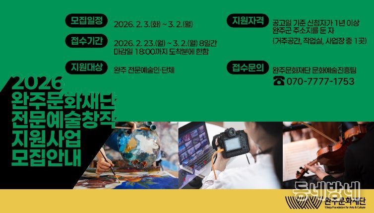 동네방네 김형규 기자 | (재)완주문화재단(이사장 유희태)은 2026년 한 해 동안 지역 예술인의 안정적인 창작활동을 지원하기 위해 2026 전문예술창작지원사업에 참여할 예술인 및 예술단체를 모집한다.
