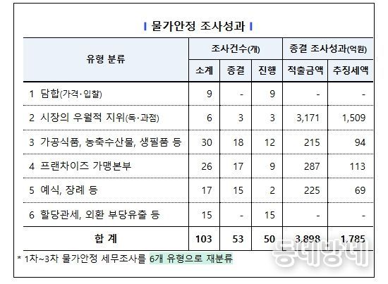 이에 국세청은 ’25.9월부터 ’26.1월까지 3차에 걸쳐, 과도한 가격 인상으로 폭리를 취하며 탈세를 일삼은 담합, 독・과점, 가공식품・생필품 제조, 농축수산물 유통 등 103개 업체에 대해 조사를 실시했으며, ’25.9.25. 착수한 1차 세무조사 결과, 53개를 종결하여 3,898억 원을 적출하고, 1,785억 원을 추징했다.
