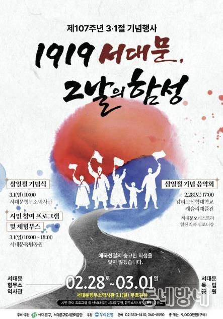 동네방네 김형규 기자 | 서대문구가 제107주년 삼일절인 3월 1일 서대문독립공원과 서대문형무소역사관 일대에서 ‘1919 서대문, 그날의 함성’을 개최한다. 삼일절 하루 전인 이달 28일에는 감리교신학대학교 웨슬리채플관에서 삼일절 기념음악회도 열린다.