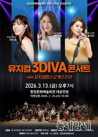 동네방네 김형규 기자 | 함양문화예술회관은 오는 3월 13일 오후 7시 신년 음악회 ‘뮤지컬 3DIVA’ 콘서트를 개최한다.