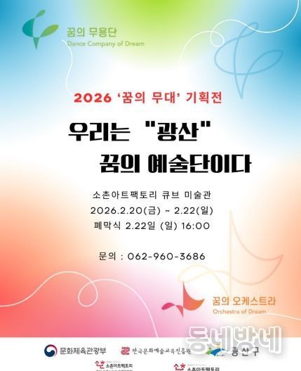 동네방네 김형규 기자 | 광주 광산구는 20일부터 22일까지 소촌아트팩토리 큐브미술관에서 2026 ‘꿈의 무대’ 아카이빙전 ‘우리는 ‘광산’ 꿈의 예술단이다‘를 연다고 밝혔다.
