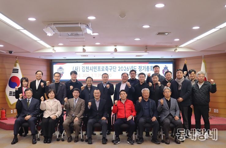 김천상무프로축구단이 2월 11일 오후 4시, 김천시청 2층 회의실에서 2026년도 정기총회를 개최했다. 행사에는 배낙호 구단주, 이재하 대표이사, 김천시체육회 최한동 회장, 여영각 후원회장을 비롯한 대의원과 이사들이 자리했다.