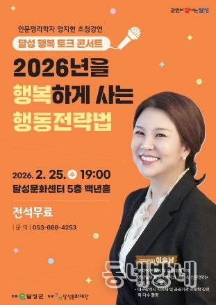 동네방네 김형규 기자 | (재)달성문화재단은 오는 2월 25일 오후 7시, 달성문화센터 백년홀에서 2026년 새해 맞이 ‘달성 행복 토크 콘서트’를 개최한다고 밝혔다.