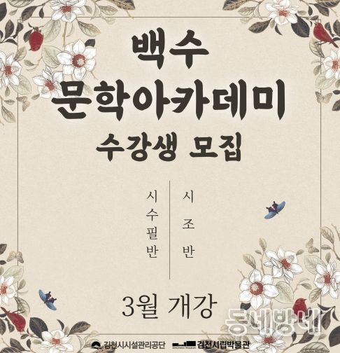 동네방네 김형규 기자 | 김천시시설관리공단(이사장 김재광)은 오는 3월부터 백수문학관과 김천시립박물관이 연계한 교육 프로그램 ‘백수문학아카데미’를 운영한다.
