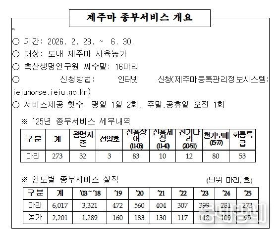 동네방네 김형규 기자 | 제주특별자치도 축산생명연구원이 오는 23일부터 6월 30일까지 제주마 사육농가를 대상으로 ‘무상 종부(교배) 서비스’를 운영한다.