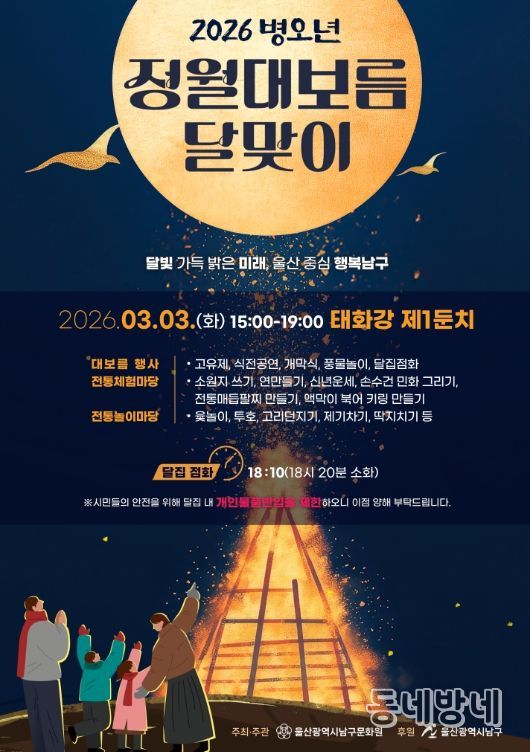 동네방네 김형규 기자 | 울산 남구는 정월대보름을 맞아 오는 3월 3일 오후 3시부터 태화강 제1둔치에서 전통 세시풍속을 계승하고 한 해의 안녕과 풍요를 기원하는 정월대보름 행사를 개최한다고 밝혔다.