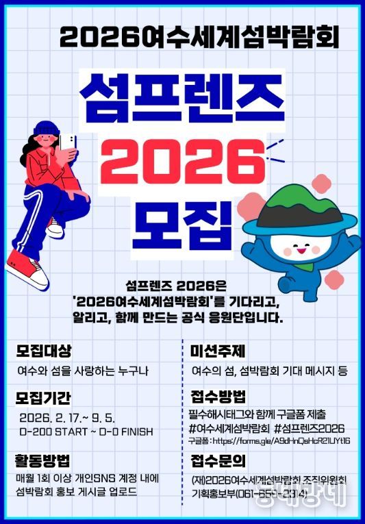 동네방네 김형규 기자 | 2026여수세계섬박람회조직위원회가 2026여수세계섬박람회 공식 응원단 ‘섬프렌즈’를 모집한다.