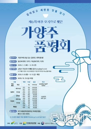 동네방네 김형규 기자 | 여주세종문화관광재단(이사장 이순열)이 오는 3월 3일부터 3월 20일까지 ‘제6회 여주 오곡으로 빚은 가양주 품평회’ 참가자를 모집한다.