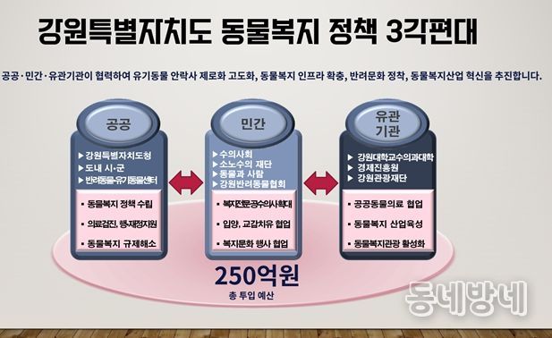 동네방네 김형규 기자 | 강원특별자치도는 2월 20일 오후 2시 강릉에 위치한 도 반려동물지원센터에서 ‘강원형 동물복지 정책’을 발표하고, 복지‧의료‧산업‧관광을 아우르는 4대 전략을 본격 추진한다고 밝혔다.