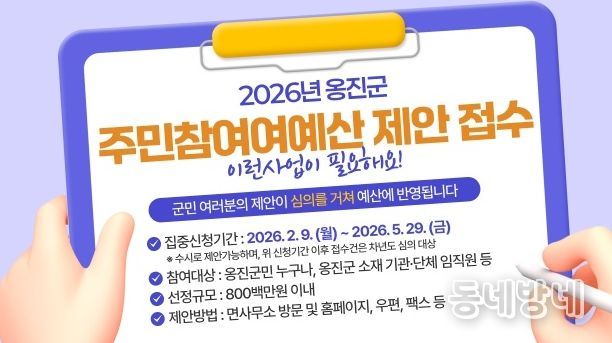 동네방네 김형규 기자 | 옹진군은 2027년 예산 편성을 앞두고 2026년 주민참여예산 사업 공모를 오는 5월 29일까지 실시한다고 밝혔다.