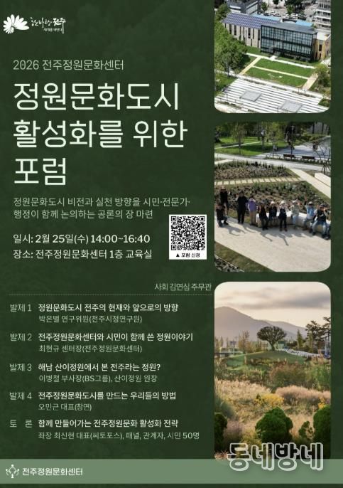 전주시 관계자는 “기후 위기와 정서적 고립이 깊어지는 시대에 이번 포럼을 통해 시민 삶의 질 향상을 위한 정원의 공공적 가치를 널리 알리고, 일상 속 정원 지향적 공간 활용을 지속해서 확대할 예정”이라고 말했다.