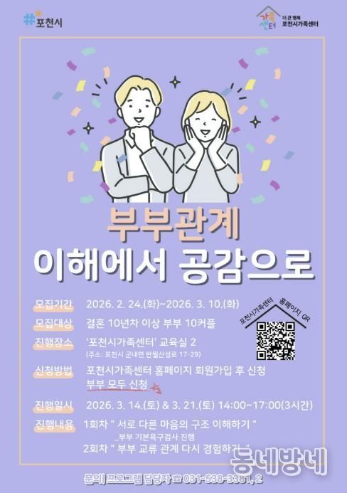 동네방네 김형규 기자 | 포천시가 직영하는 더 큰 행복 포천시가족센터는 오는 24일부터 결혼 10년 이상 부부를 대상으로 한 관계 증진 프로그램 ‘부부 관계 이해에서 공감으로’ 참여자를 모집한다.