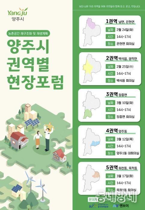 동네방네 김형규 기자 | 양주시가 오는 24일부터 3월 17일까지 5차례에 걸쳐 ‘농촌공간 재구조화 및 재생 기본계획’ 수립을 위한 권역별 주민현장포럼을 개최할 예정이다.