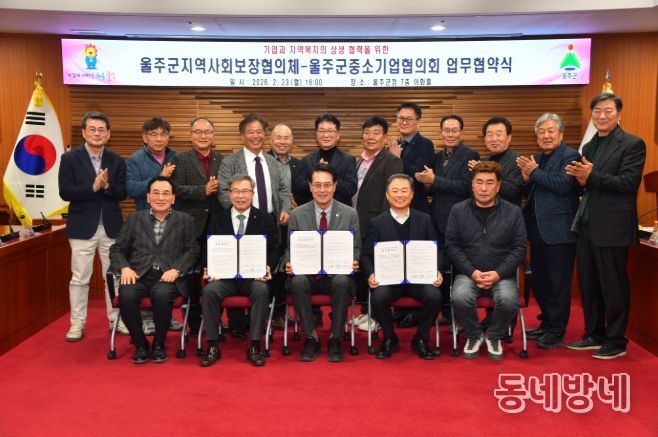 동네방네 김형규 기자 | 울주군 지역사회보장협의체(공동위원장 이순걸, 원경연)가 울주군 중소기업협의회(회장 박용운)가 23일 울주군청 이화홀에서 ‘기업과 지역복지의 상생 협력’을 위한 업무협약을 체결했다.