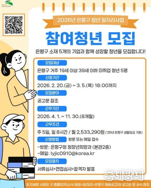 동네방네 김형규 기자 | 서울 은평구는 ‘2026년 청년 일자리사업’에 참여할 청년 5명을 다음 달 5일까지 모집한다고 밝혔다.