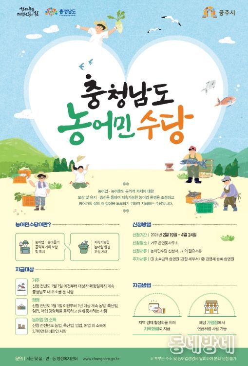 동네방네 김형규 기자 | 공주시는 오는 4월 24일까지 농어업경영체에 등록된 농어업인을 대상으로 2026년 농어민수당 신청을 받는다고 밝혔다.