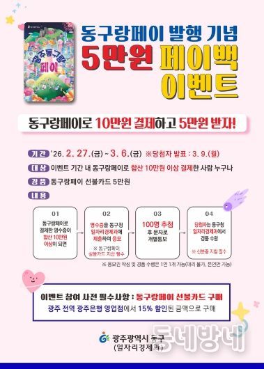 한편 동구랑페이 선불카드는 지난 23일 발행을 시작했으며, 광주 전역 광주은행 영업점에서 15% 할인된 금액으로 구매할 수 있다. 동구는 이번 페이백 이벤트가 지역경제 활성화에 긍정적인 효과를 가져올 것으로 기대하고 있다.