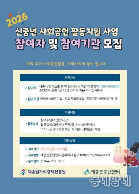 동네방네 김형규 기자 | 세종일자리경제진흥원이 운영하는 세종신중년센터에서 퇴직 신중년의 지식과 경력을 지역사회에 환원하는 ‘2026년 신중년 사회공헌 활동지원 사업’ 참여자와 참여기관을 오는 3월 8일까지 모집한다.
