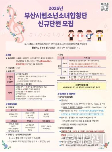 동네방네 김형규 기자 | 부산시립소년소녀합창단이 3월 4일부터 17일까지 2026년 신규단원 모집을 실시한다.