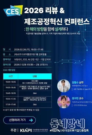 동네방네 김형규 기자 | 대구광역시는 2월 26일 오후 4시, 대구기계부품연구원 글로벌홀에서 ‘CES 2026 리뷰·제조공정혁신 컨퍼런스’를 개최한다.