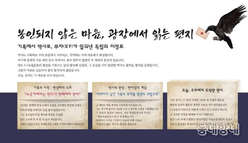 동네방네 김형규 기자 | 경상남도기록원은 제107주년 3·1절을 맞아 일제의 엄혹한 감시 속에서도 꺼지지 않았던 독립의 기록을 현대적 예술로 재해석한 특별전 '봉인되지 않은 마음, 광장에서 읽는 편지'를 개최한다.