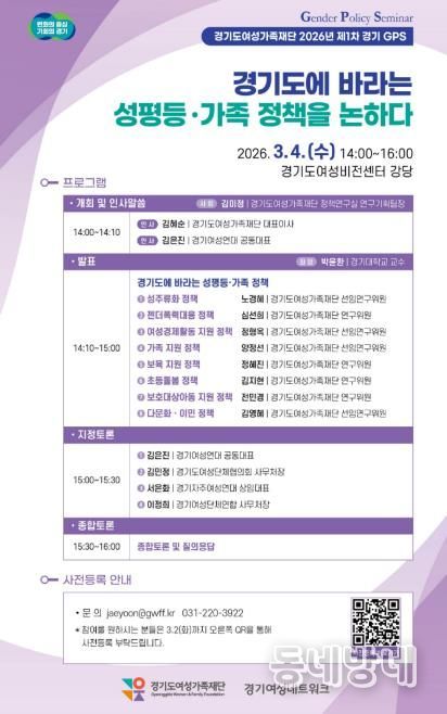 동네방네 김형규 기자 | 경기도여성가족재단이 다음달 4일 경기도여성비전센터 대강당에서 ‘경기도에 바라는 성평등·가족 정책을 논하다’ 라는 주제로 정책토론회를 연다.