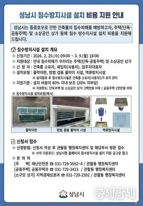 동네방네 김형규 기자 | 성남시는 여름철 집중호우로 인한 주택과 상가의 침수 피해를 사전에 예방하기 위해 침수방지시설 설치 비용을 최대 80%까지 지원한다.