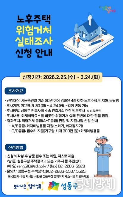 동네방네 김형규 기자 | 서울 성동구는 지난해 전국 최초로 도입해 큰 성과를 거둔 ‘위험거처 실태조사’ 대상을 20년 이상 노후주택으로 확대해 주거개선 지원사업을 추진한다고 밝혔다.