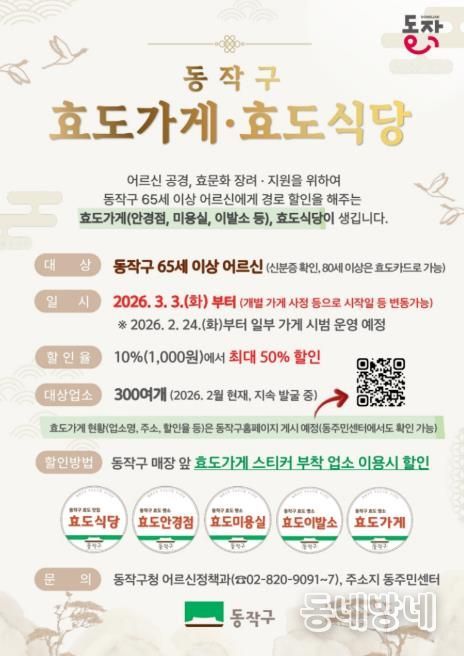 박일하 동작구청장은 “효도가게는 경로효친 사상을 담아 어르신들의 경제적 부담을 덜어드리고, 지역경제와 상생하기 위해 준비한 사업”이라며, “앞으로도 참여 업소를 지속적으로 확대해 어르신 복지 체감도를 높여가겠다”라고 말했다.