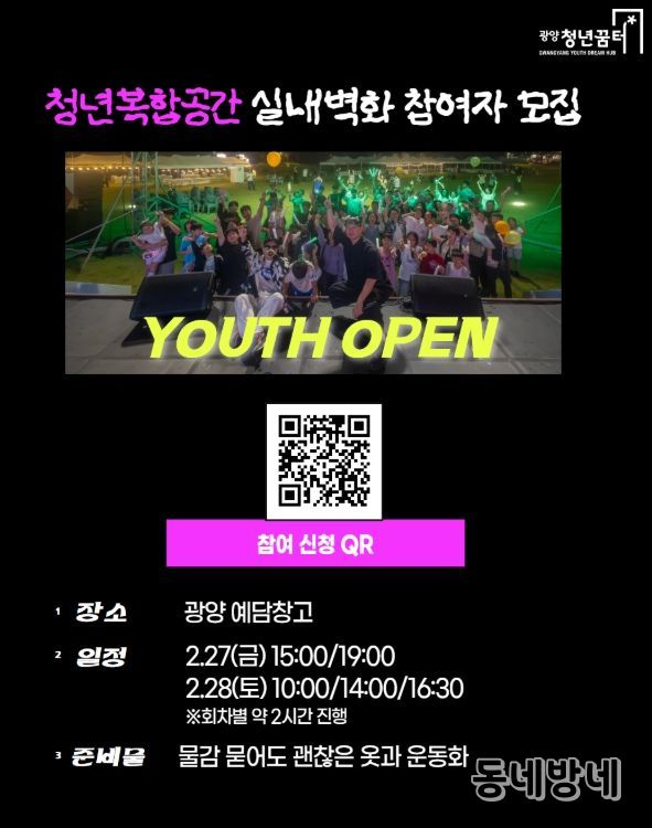 한편, 청년복합공간 실내벽화 프로젝트 참여자 모집과 관련된 자세한 사항은 광양청년꿈터 누리집 또는 전화 문의를 통해 확인할 수 있다.