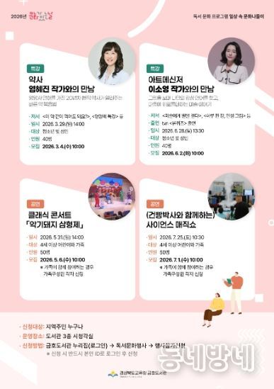 동네방네 김형규 기자 | 경상북도교육청 금호도서관(관장 박경숙)은 2026년 문화가 있는 날을 맞이하여 영천 시민을 위한 독서문화프로그램 '일상 속 문화 나들이'를 운영한다.