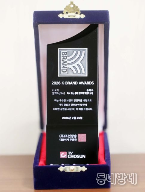 동네방네 김형규 기자 | 서울 송파구가 25일 서울 더플라자호텔에서 열린 ‘2026 TV조선 K-브랜드 어워즈’ 시상식에서 K-도시(창의혁신도시) 부문 대상을 수상했다.