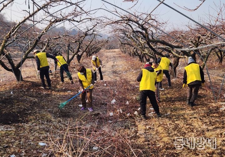 올해 사업은 지난 7일 새마을꽃마실봉사단 12명이 심천면 금정리에서 복숭아 나무 가지 줍기 및 전지 작업을 지원하며 시작됐다.
