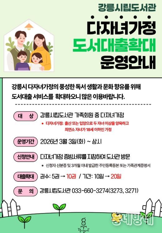 동네방네 김형규 기자 | 강릉시립도서관은 오는 3월 3일부터 도서관 가족회원 중 다자녀가정을 대상으로 도서 대출 서비스를 확대 운영한다.