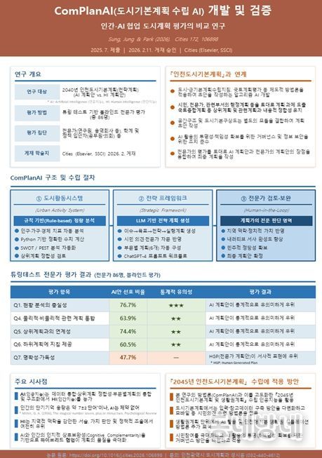해당 방법론은 국제적으로도 이미 검증을 마쳤다. 2040년 인천도시기본계획 변경 수립 경험을 바탕으로 인공지능과 인간의 계획 특성을 비교·분석한 연구 '컴플랜에이아이를 활용한 도시계획(Planning with ComPlanAI)'은 2026년 2월 21일 사회과학인용색인(SSCI) 등재 도시계획 분야 최상위 국제학술지인 Cities(시티즈)에 게재됐다.