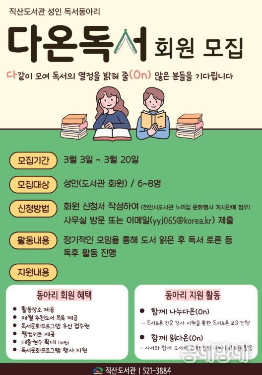 동네방네 김형규 기자 | 천안시 직산도서관은 내달 3~ 20일 성인 독서동아리 ‘다온독서’ 참여자를 모집한다고 26일 밝혔다.