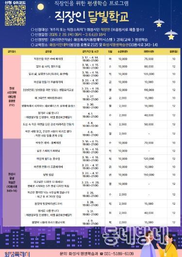 동네방네 김형규 기자 | 화성특례시는 2월 26일부터 3월 6일까지 직장인 달빛학교 1차 수강생을 선착순으로 모집한다고 밝혔다.