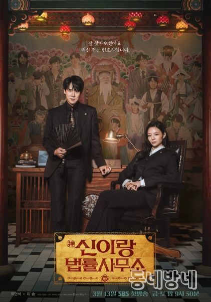 앞서 공개된 티저 포스터에서는 부적이 가득 붙은 벽면과 향로의 연기가 자욱한 옥천빌딩 501호의 ‘신이랑 법률사무소’가 “보이지 않는 진실을 변호합니다”라는 문구를 내세우며 기묘한 세계관의 시작을 알렸다. 그리고 이번 메인 포스터에서는 그 수상한 공간이 보다 선명하게 위용을 드러낸다. 고풍스러운 법률사무소 내부, 그 중심에 자리한 변호사 신이랑(유연석)과 한나현(이솜)의 뒷 배경에 전통 민화풍으로 그려진 신적 존재들과 망자가 차지하고 있는 것. 이곳이 단순한 로펌이 아닌, 보이지 않는 세계와 연결된 장소임을 직관적으로 보여주는 대목이다.