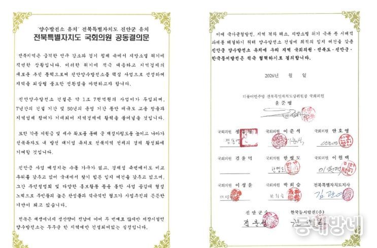 진안군 관계자는 “양수발전소 유치는 진안군을 넘어 전북 전체의 미래 경쟁력과 직결된 과제”라며 “전북특별자치도와 지역 국회의원들이 함께 뜻을 모아 공동서명으로 이어졌다는 것은 전북이 하나의 팀으로 움직이고 있다는 상징적인 의미를 갖는다”고 밝혔다.