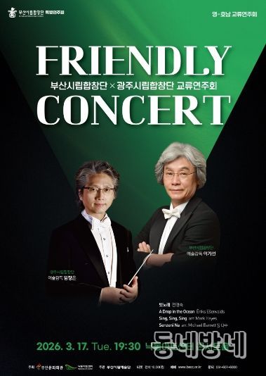 동네방네 김형규 기자 | 부산시립합창단(예술감독 이기선)은 오는 3월 17일 오후 7시 30분, 낙동아트센터 콘서트홀에서 '부산-광주시립합창단 교류연주회 프렌들리 콘서트(Friendly Concert)'를 개최한다.