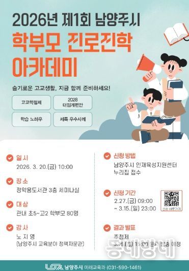 동네방네 김형규 기자 | 남양주시는 오는 27일부터 정약용도서관에서 열리는 ‘2026년 제1회 학부모 진로진학 아카데미’ 참가자를 모집한다고 밝혔다.