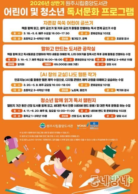 동네방네 김형규 기자 | 원주시립중앙도서관은 오는 3월부터 6월까지 ‘2026년 상반기 어린이 및 청소년 독서문화 프로그램’을 운영한다.