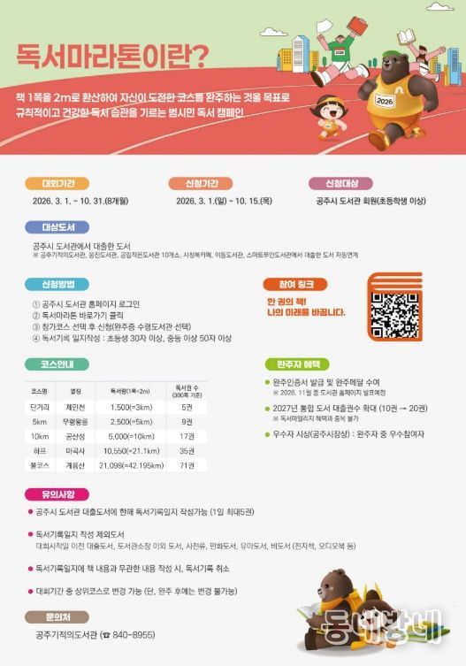 박찬옥 평생학습과장은 “독서마라톤은 긴 호흡으로 책과 가까워지며 성취감을 느낄 수 있는 특별한 여정”이라며 “공주의 아름다운 명소를 여행하는 마음으로 많은 시민이 참여해 책을 통해 일상을 더욱 풍요롭게 가꾸길 바란다”고 말했다.