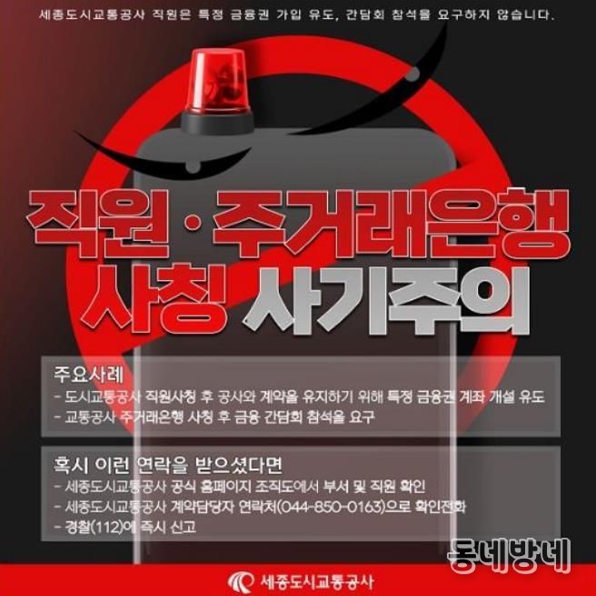 동네방네 김형규 기자 | 세종도시교통공사는 최근 공사 임직원을 사칭하여 고액의 물품 구매 대행을 요청하는 사기 사례가 확인됨에 따라 시민과 협력 업체에 각별한 주의를 당부했다.