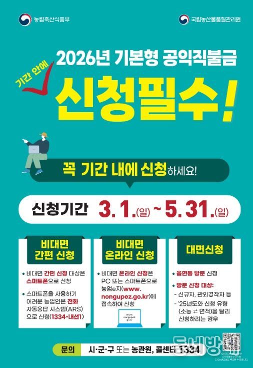 신청은 비대면과 방문 신청을 병행해 추진한다. 2025년 기본직불 등록정보와 2026년 농업경영체 등록정보에 변동이 없고, 사전 자격 검증 결과 적격으로 확인된 농업인은 스마트폰 모바일 신청 또는 자동응답시스템을 통해 간편하게 신청할 수 있다.