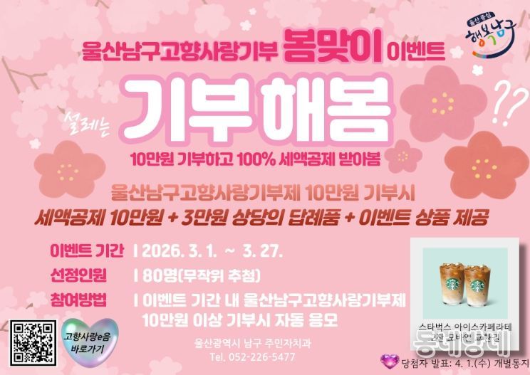 동네방네 김형규 기자 | 울산 남구가 봄을 맞아 고향사랑기부제 참여 활성화를 위해기부자 참여이벤트를 진행한다.