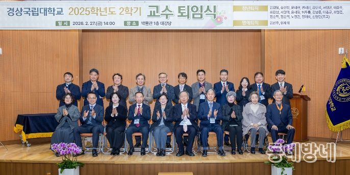 동네방네 김형규 기자 | 경상국립대학교는 2월 27일 오후 2시 가좌캠퍼스 박물관 1층 대강당에서 2025학년도 2학기 교수 퇴임식을 개최했다. 교수 퇴임식은 후학양성과 대학발전을 위해 커다란 발자취를 남기고 정년을 맞아 퇴직하는 교수들의 공로를 기리기 위해 마련됐다.